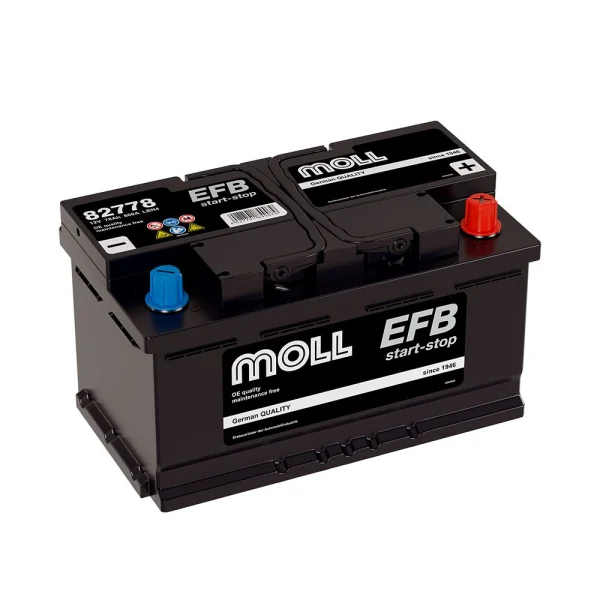 Представляем автомобильный Аккумулятор MOLL EFB 78Ah euro EN800, страна производитель которого: Германия. Этот аккумулятор обладает ёмкостью 78 А/ч и пусковым током 800 А, что обеспечивает надежный запуск автомобиля.